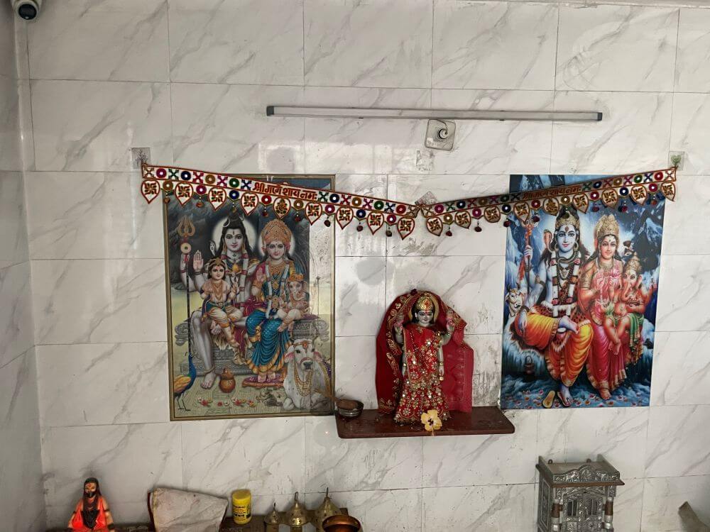 Next to these temples is an east-facing temple dedicated to Umbaeshwar Mahadev. On its facade wall near the entrance door, there are elegant idols of Hanuman on the left and Ganesh on the right. Upon entering through the door, one immediately sees a small pedestal with a marble idol of Nandi and a tortoise in front of it. In the center of the sanctum is a shivpind dedicated to Umbaeshwar Mahadev. Here lies a circular marble pedestal with a stone lingam over which a serpent holds its canopy. Abhisheka (ritual bathing) occurs over this pind from an overhead vessel. Above this vessel is a silver canopy. Behind the Shivling on the wall is an idol of Parvati Mata flanked by images of Shiv, Parvati and Ganesh.