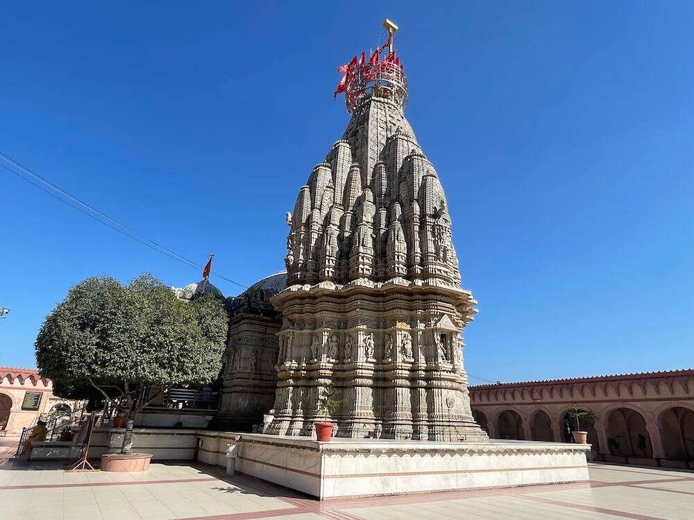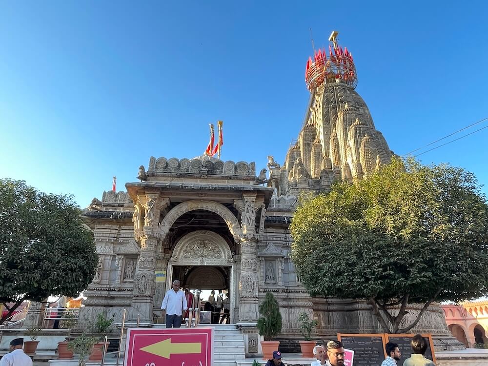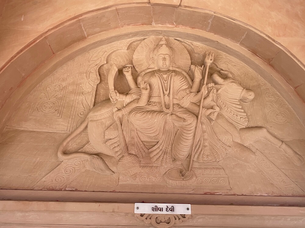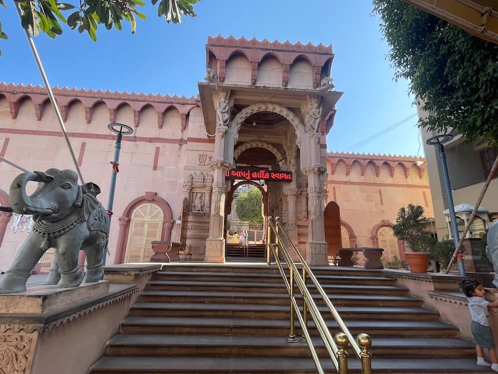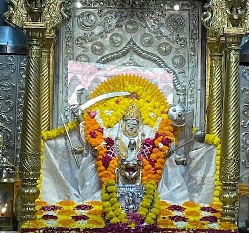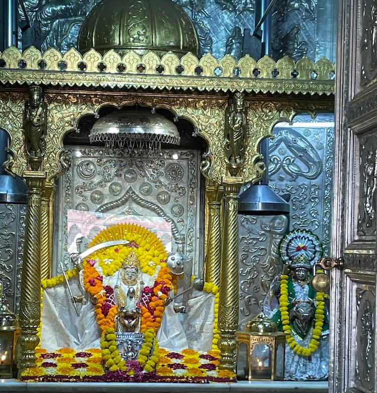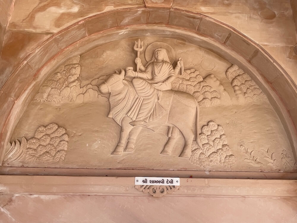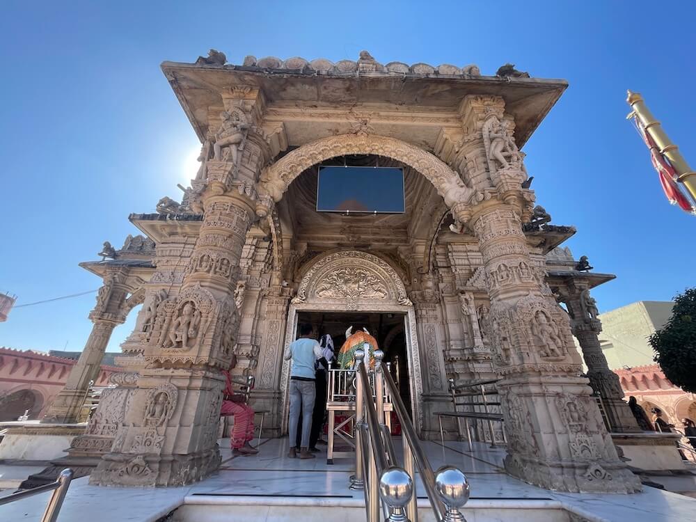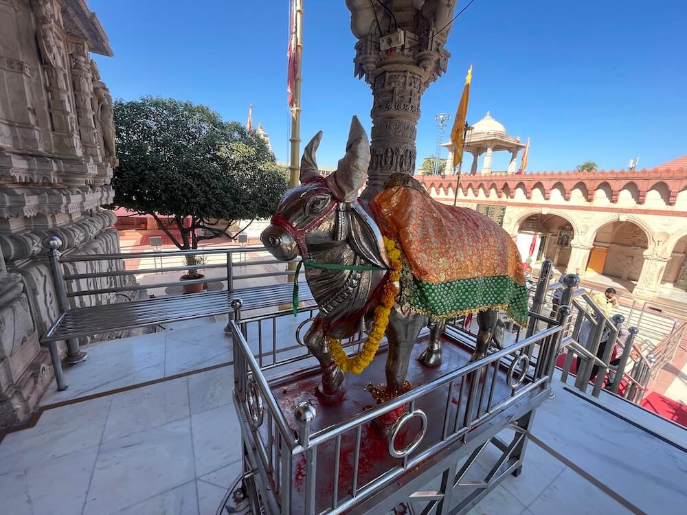 The temple precincts are remarkably vast. Outside the main grand portal lie the administration office and the ‘Prasad’ counter, surrounded by numerous shops selling ritual offerings. Great stone elephants (Gajashilpas) at the gateway welcome the pilgrims. The temple’s architecture is a quintessential example of traditional Gurjar style, meticulously crafted by skilled artisans from Rajasthan using pink sandstone from Bansi Paharpur. Intricate stone carvings and soaring domes enhance its ethereal beauty. The central dome is considered a masterpiece of architectural ingenuity, adorned with symbols representing divine energy. The temple stands upon a high plinth (Jagati), with smaller shrines flanking the stairs of the main entrance. Within the entrance porch (Mukhmandapa) stands a metallic statue of the sacred bull, ‘Vrushabh’, the Goddess’s mount.