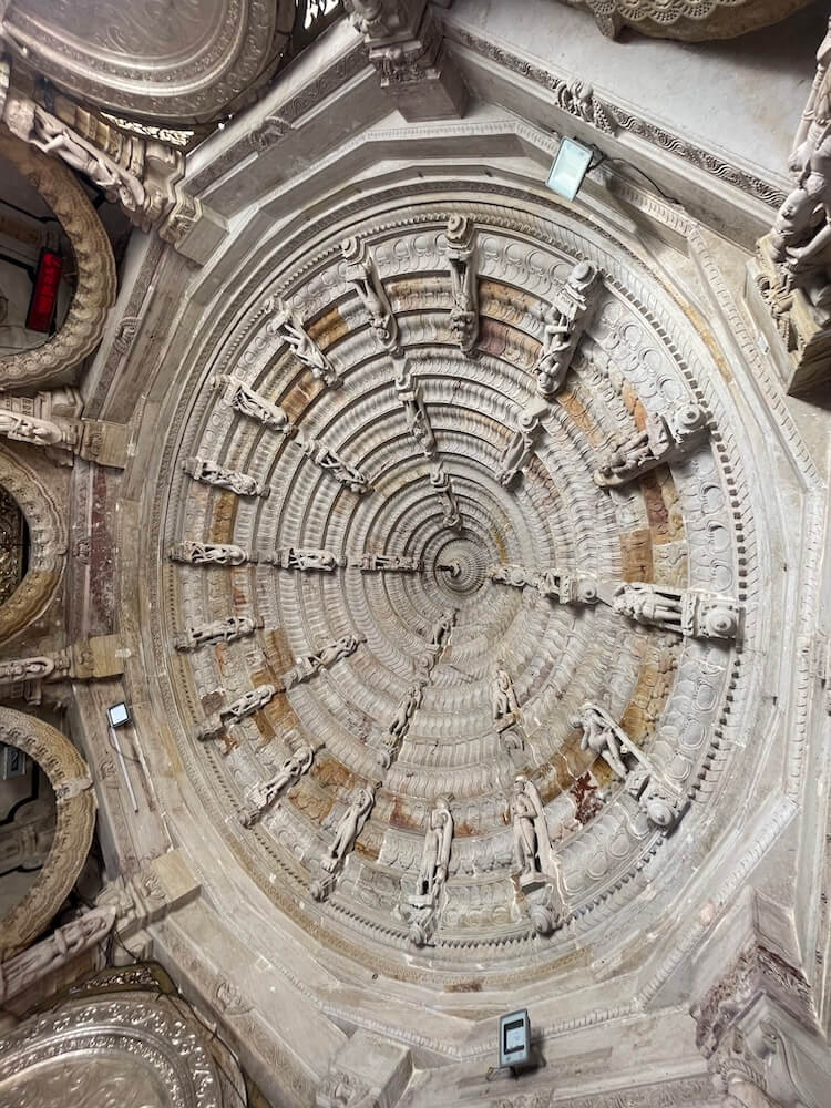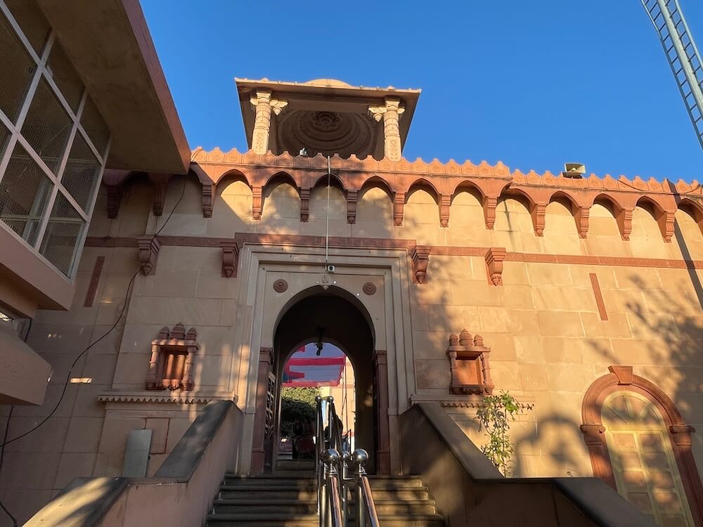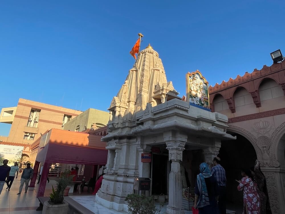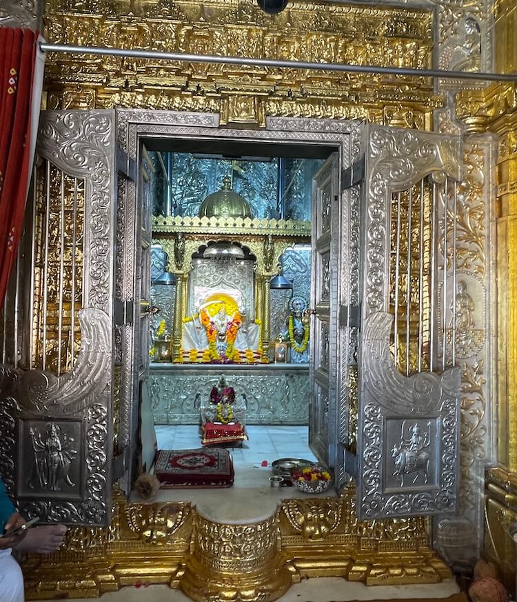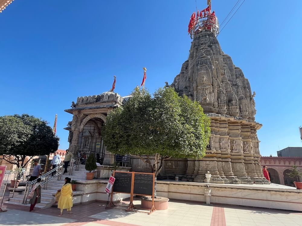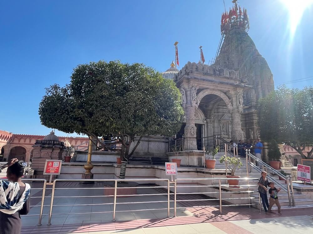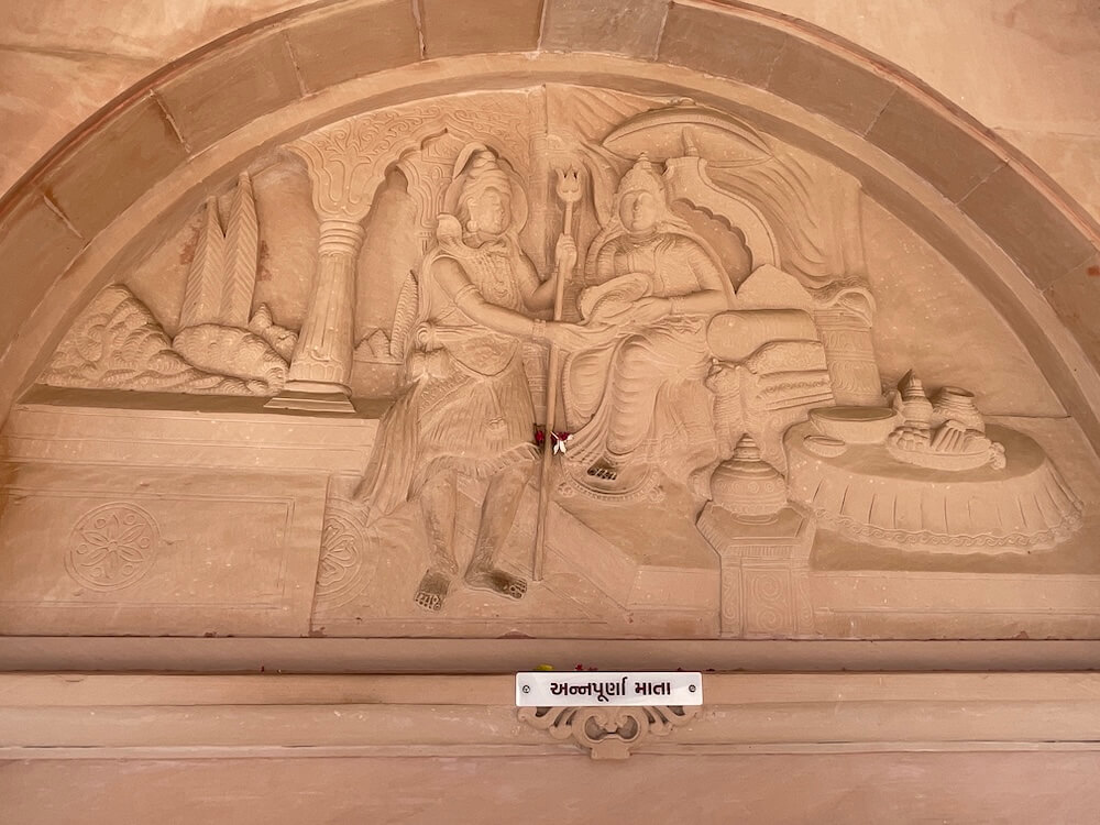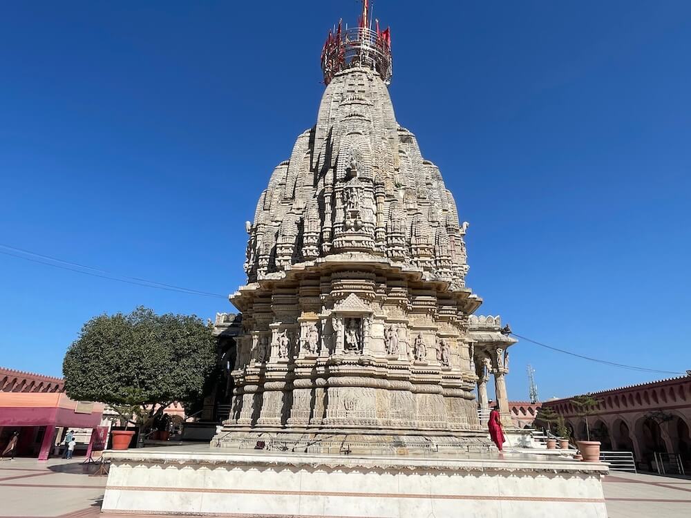The temple precincts are remarkably vast. Outside the main grand portal lie the administration office and the ‘Prasad’ counter, surrounded by numerous shops selling ritual offerings. Great stone elephants (Gajashilpas) at the gateway welcome the pilgrims. The temple’s architecture is a quintessential example of traditional Gurjar style, meticulously crafted by skilled artisans from Rajasthan using pink sandstone from Bansi Paharpur. Intricate stone carvings and soaring domes enhance its ethereal beauty. The central dome is considered a masterpiece of architectural ingenuity, adorned with symbols representing divine energy. The temple stands upon a high plinth (Jagati), with smaller shrines flanking the stairs of the main entrance. Within the entrance porch (Mukhmandapa) stands a metallic statue of the sacred bull, ‘Vrushabh’, the Goddess’s mount.