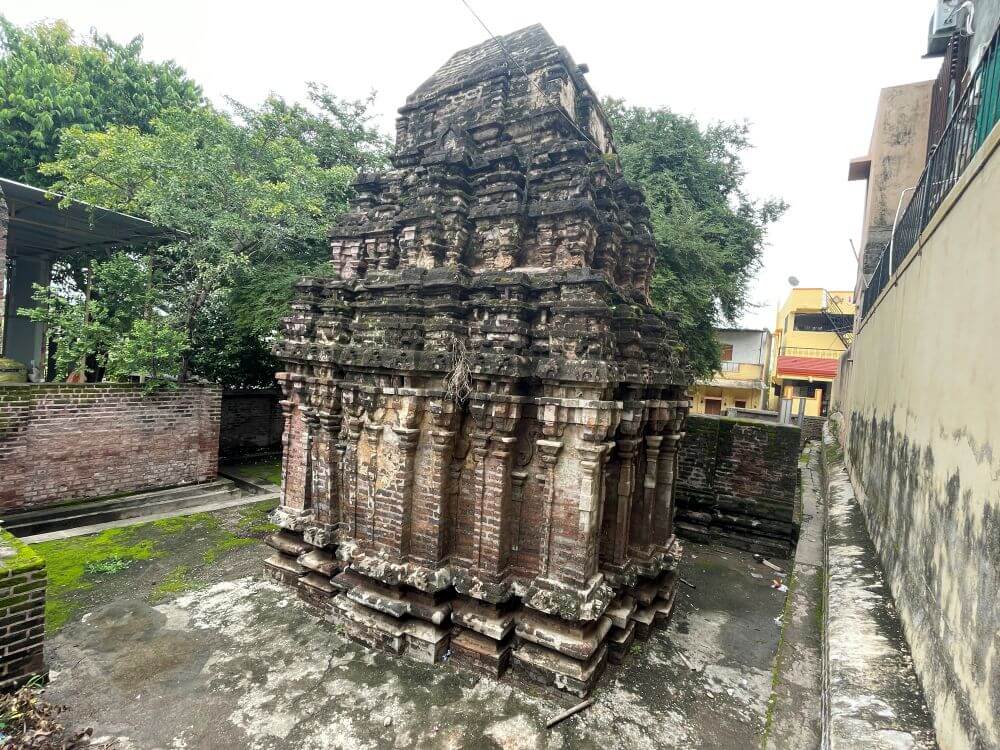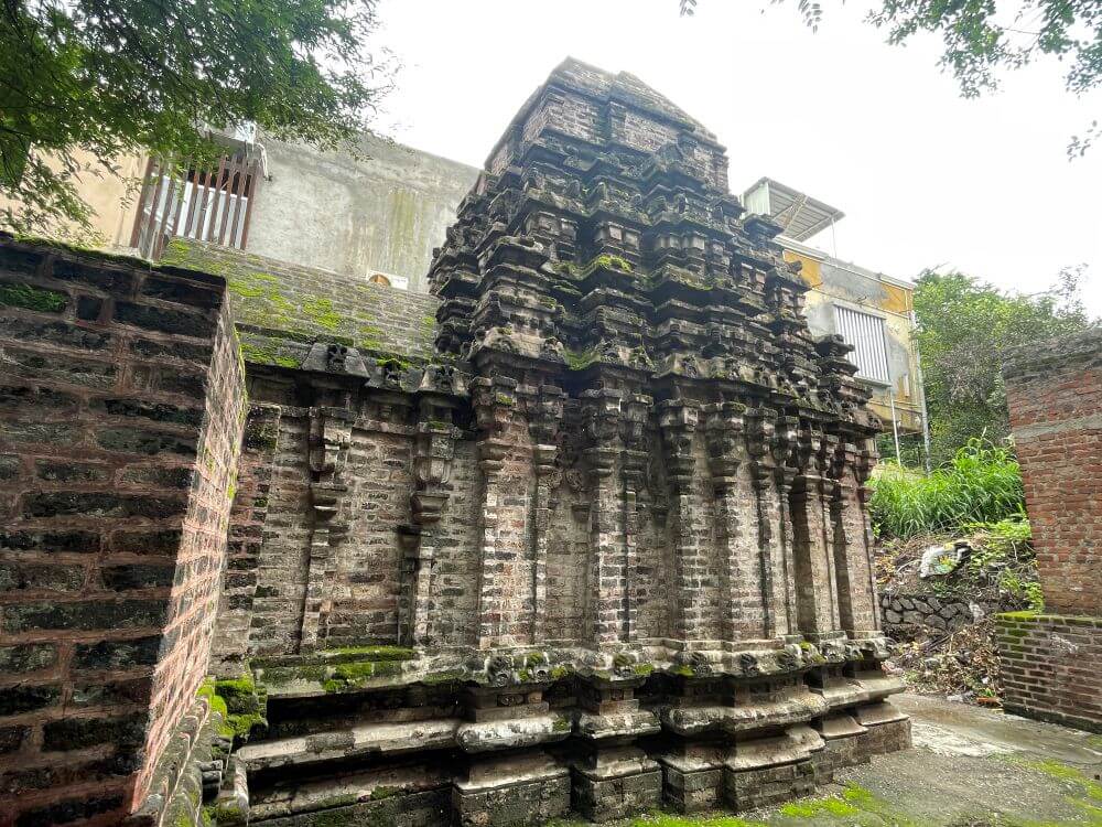 मंडोवरावर नक्षीदार स्तंभांच्या रांगा आहेत. दोन स्तंभांच्या मधल्या जागेत मकरतोरण नक्षी आहे. स्तंभांमध्ये स्तंभपाद, स्तंभदंड, कणी, हस्त असे भाग विटा वापरून घडवले असल्याने ते वेगळे व वैशिष्ट्यपूर्ण आहेत. विटांचे मोजमाप १६ इंच रूंद ९ इंच उंच व २१ इंच लांब असे आहे. स्तंभांवर सज्जा व छतावर शिखर आहे. द्रविडी शैलीतील या शिखराचा छतापासूनचा भाग वर लहान लहान होत जाऊन कळसाजवळ बिंदुरूप होतो.