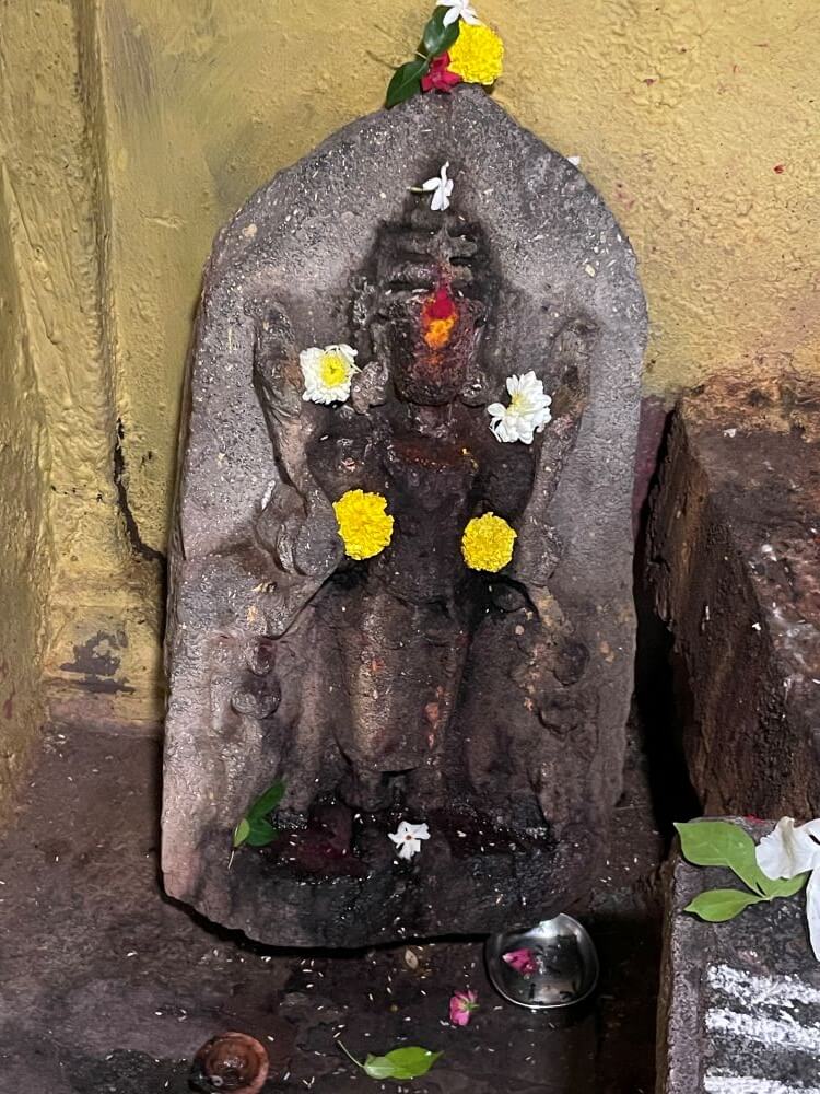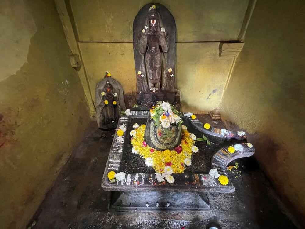 उंच पाषाणपिठावर असलेल्या या शिवपिंडीची शाळूंका चौकोनी आहे. गर्भगृहात मागील भिंतीलगत काळ्या पाषाणातील दोन द्विभुज सूर्यमूर्ती आहेत. मूर्तींच्या दोन्ही हातात कमळ पुष्प व पायाजवळ सात घोडे कोरलेले आहेत. मूर्तींच्या डोक्यावर मुकुट, गळ्यात विविध प्रकारच्या माळा, कमरबंध, उदरबंध, मेखला तसेच विविध वस्त्रे कोरलेली आहेत. मूर्तींच्या दोन्ही बाजूला पायाजवळ दोन शक्तीमूर्ती आहेत. त्या दिवस व रात्रीचे प्रतीक असल्याचे सांगितले जाते.