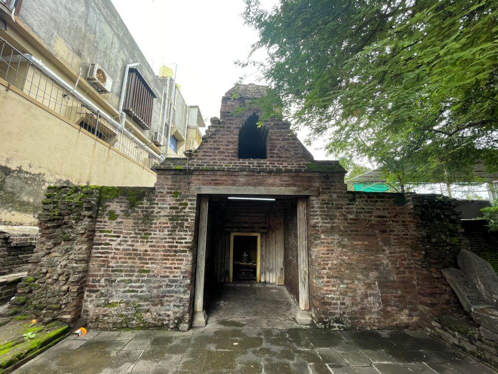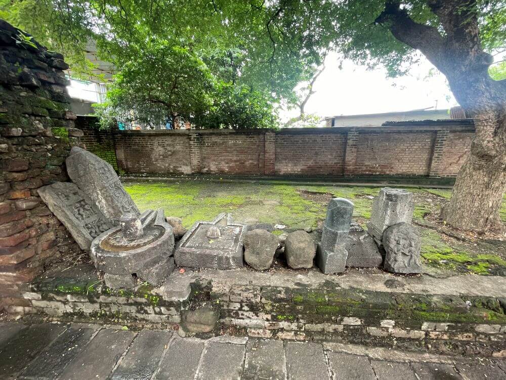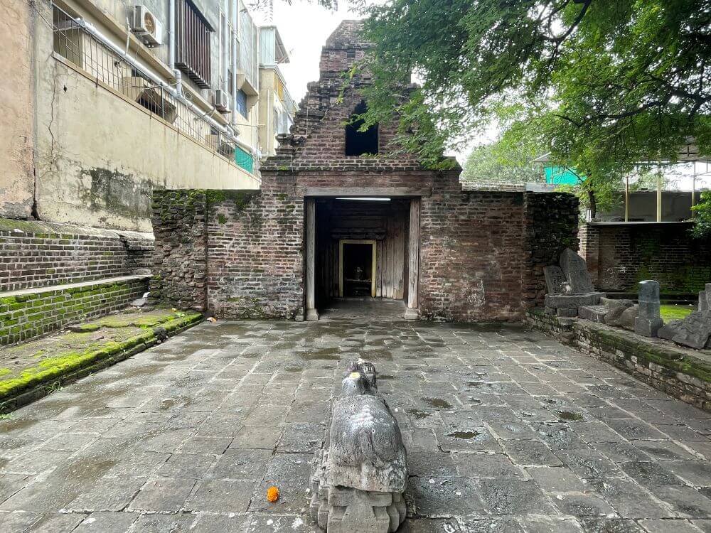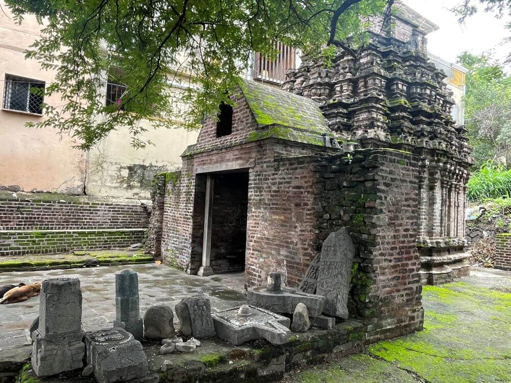 रस्त्यालगत असलेल्या या मंदिराची भक्कम तटबंदी भाजलेल्या विटा वापरून बांधलेली आहे. या पुरातन तटबंदीला अलिकडील काळात गिलावा केलेला आहे. तटबंदीतील प्रवेशद्वारातून मंदिराच्या फरशी आच्छादित प्रांगणात प्रवेश होतो. प्रांगणात काही प्राचीन वृक्ष व उजव्या बाजूच्या तटबंदीत आसने आहेत. हे मंदिर सध्या भारतीय पुरातत्त्व खात्याच्या अखत्यारित आहे. मंदिरासमोर वज्रपिठावर नंदीची काळ्या पाषाणातील मूर्ती आहे. नंदी मूर्तीवर घुंगरमाळ, पाठीवरील झुल, वशिंड, शेपटी आदी अत्यंत बारीक तपशिल कोरलेला आहे. प्रांगणात मंदिरासमोर असलेल्या अर्धभींती पाहून पूर्वी येथे लाकडी छताचा सभामंडप असल्याचा अंदाज व्यक्त केला जातो. या अर्धवट भिंतीलगत काही प्राचीन शिवपिंडी, समाधीपाषाण, वीरगळ आदी शिल्पे आहेत. तटबंदीच्या भिंतीलगत विष्णू व महादेव यांच्या प्राचीन व जीर्ण मूर्ती आहेत.