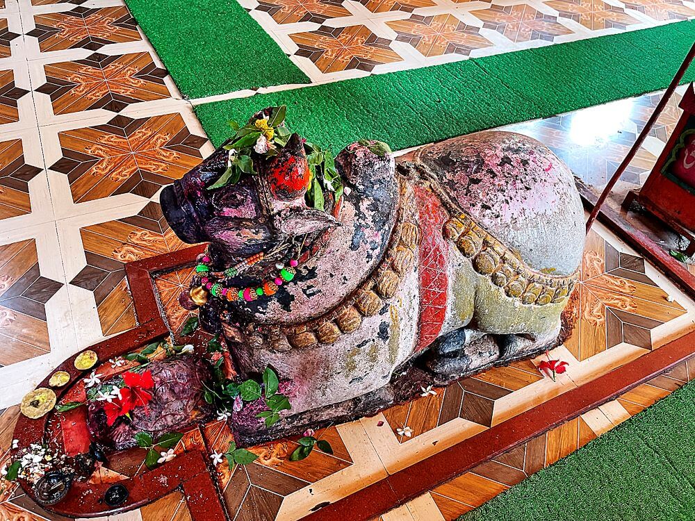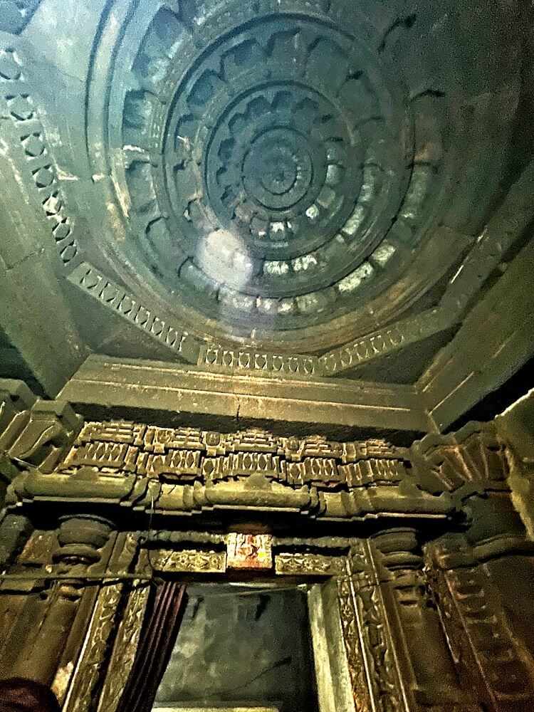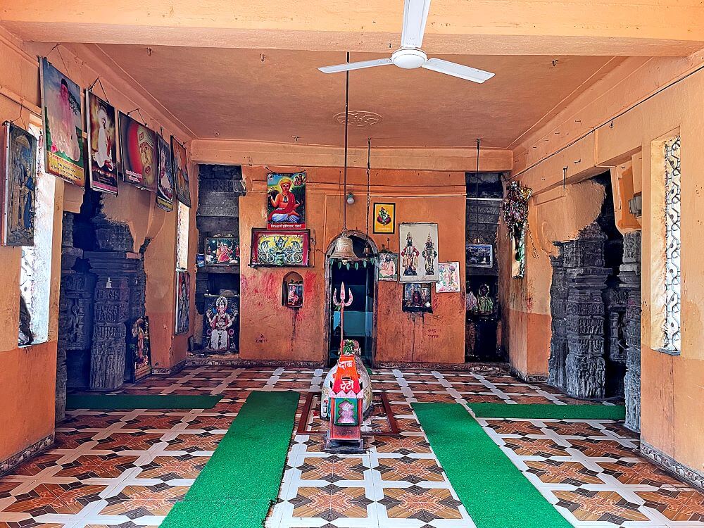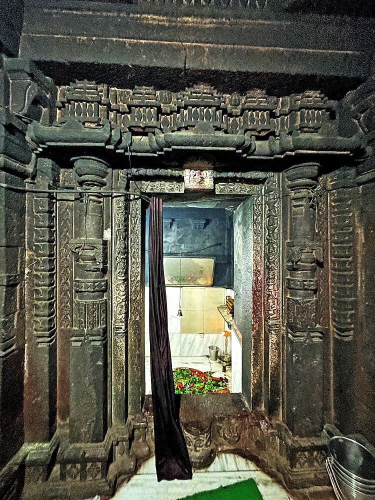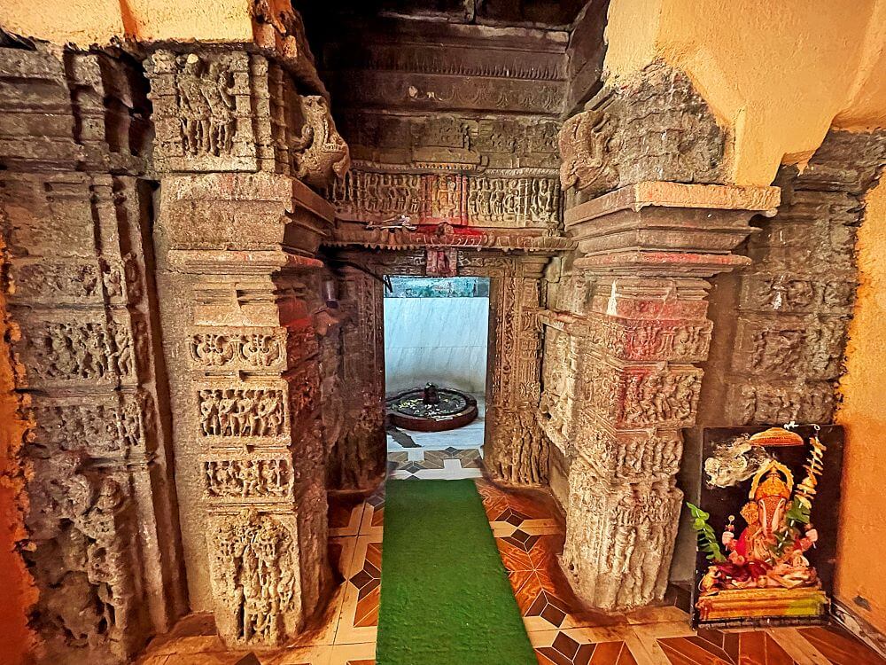 मुख्य गर्भगृहासमोरील मंडपात मोठा नंदी असून त्याच्या शरीरावर सुंदर अलंकार आहेत. या पूर्वाभिमुख मंदिराला पश्चिम, दक्षिण आणि उत्तर दिशेला अशी तीन गर्भगृहे आहेत. सर्व गर्भगृहे वेगवेगळ्या अंतराळांच्या माध्यमातून एकाच सभामंडपाशी जोडलेले आहेत. तिन्ही गर्भगृहांच्या अंतराळांमध्ये देवकोष्ठे आहेत. त्यात ब्राह्मी, सरस्वती, वैष्णवी यांच्या मूर्ती आहेत. मंदिराच्या प्रवेशद्वाराप्रमाणेच गर्भगृहांवरील प्रवेशद्वारांवरही कोरीवकाम आहे. मुख्य गर्भगृहाच्या उंबरठ्यावर कीर्तिमुख आहे. तेथे चार द्वारशाखा कोरलेल्या दिसतात. वादक, व्याल, स्तंभ कलश या प्रतीकांचे द्वारशाखांवर अंकन केलेले आहे. गर्भगृहाच्या द्वारावर चार शाखा असतील तर त्यास गांधारी किंवा मध्यद्वार असे म्हटले जाते. गर्भगृहाच्या मुख्य द्वाराजवळ वरच्या भागात शंख चिपळ्या वाजवणाऱ्या, नृत्य करणाऱ्या स्त्रीपुरुषांचे शिल्प तसेच नक्षीकाम आहे. प्रवेशद्वाराच्या ललाटबिंबावर गणेशाची मूर्ती आहे. मुख्य गर्भगृहात जाताना चारपाच पायऱ्या उतराव्या लागतात. या चौरसाकृती गर्भगृहाच्या आत मध्यभागी शिवलिंग आहे. डावीकडील उजवीकडील गर्भगृहात ही शिवलिंगे असून प्रत्येक गर्भगृहाच्या टोकाला कीर्तिमुखे आहेत. तिन्ही गर्भगृहांच्या तोरणभिंतीवर अष्टमातृकांची शिल्पपट्टी आहे. या अष्टमातृका राजहंस, ऐरावत, वृषभ, वराह, मनुष्य यावर बसलेल्या आहेत. वेरूळच्या लेण्यांमध्येही अशा मातृकांची शिल्पे पाहायला मिळतात.