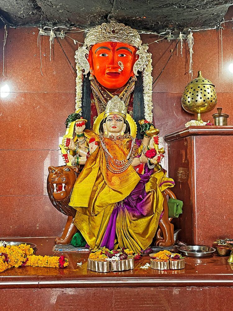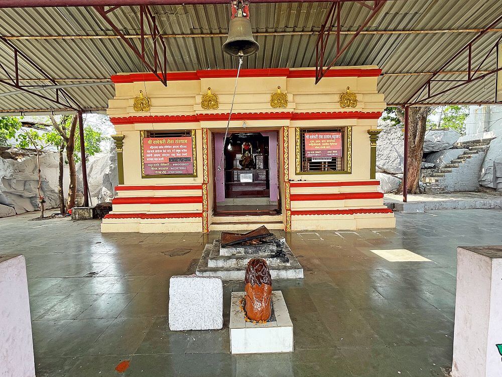 देवी येथेच स्थानापन्न झाली. उंच डोंगरावर असलेल्या या मंदिरापर्यंत जाण्यासाठी पायथ्यापासून पक्का रस्ता आहे. डोंगराच्या पायथ्याशी मंदिराची कमान आहे. वाहनतळापासून सुमारे वीस पायऱ्या चढून मंदिरापर्यंत येता येते. पायऱ्यांच्या एका बाजूला डोंगरकडा तर दुसऱ्या बाजूला सुरक्षा कठडा आहे. बाजूला असलेल्या कातळावर महादेव व गणेशाचे चित्र रंगविलेले आहे. पायऱ्या चढून मंदिराच्या फरसबंदी प्रांगणात प्रवेश होतो.