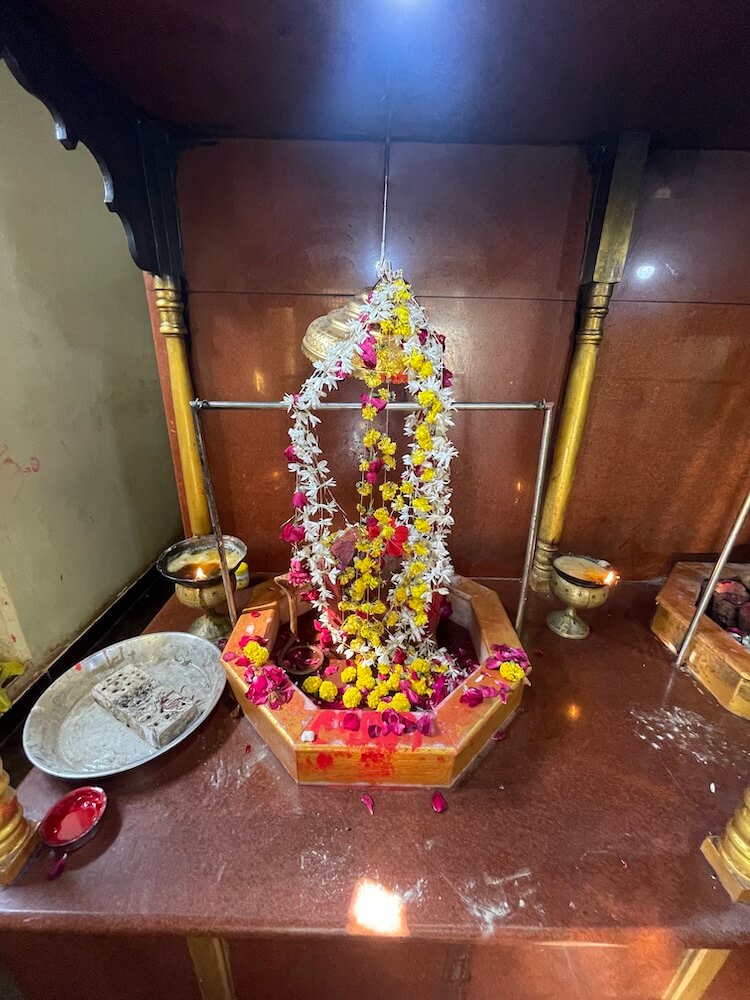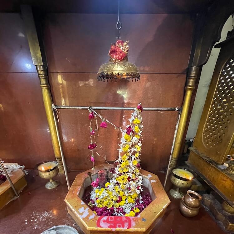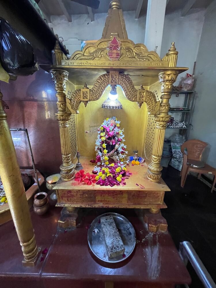 a Sabhamandapa (assembly hall) and a golden Makhar (ornamental frame) set upon a high pedestal. In a niche on the left of the temple’s verandah, stones representing village deities are placed. A wooden flagstaff stands to the right. Within the marble-floored assembly hall, a passage for Darshan (sacred viewing) runs along the walls. At the front, two large ornamental frames on a high marble pedestal house two Shivpinds. These icons are surrounded by an octagonal railing similar to a Shalunka (pedestal), which is encased in brass. The Pind in the right frame holds a large stone Shivalinga, while the one on the left contains Lingas in the form of rounded stones. Both icons are sheltered by brass canopies. Beside these ornamental frames is a golden shrine where a marble idol of Shri Krishna, beautifully adorned with garments, ornaments and flower garlands, is consecrated.
