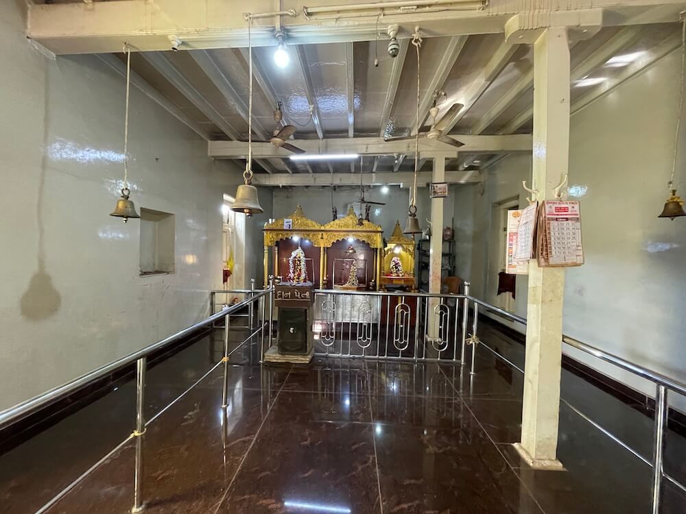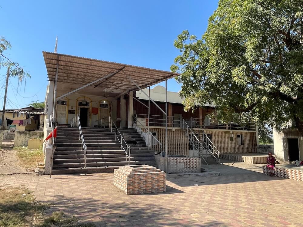 The temple is nestled within a spacious courtyard on one side of the village. Entrance to this courtyard is through an archway set into the compound wall. To the right of the courtyard stands an ancient neem tree, surrounded by a large stone platform. A short distance away lies a square Yagyakunda (sacrificial fire pit) finished with marble tiles. Directly ahead is the two-storey temple building, constructed in a modern architectural style. Thirteen wide steps lead up to the temple. They are covered by a corrugated metal shed to provide shade for devotees. The temple structure consists of a small Ovari (verandah),