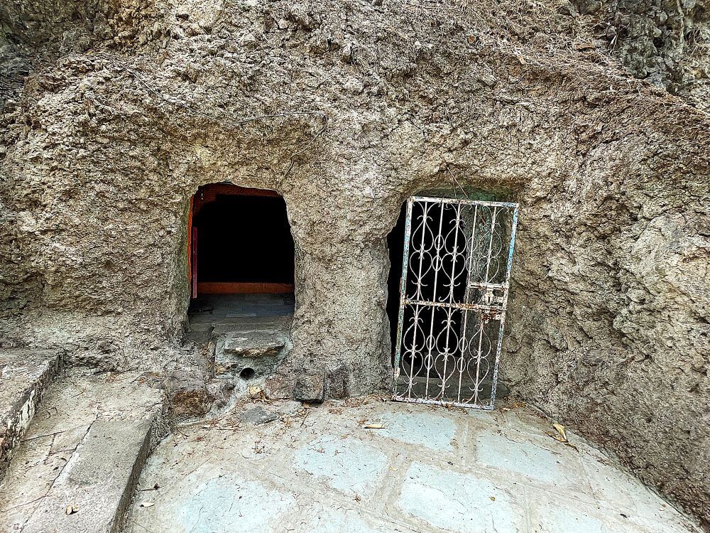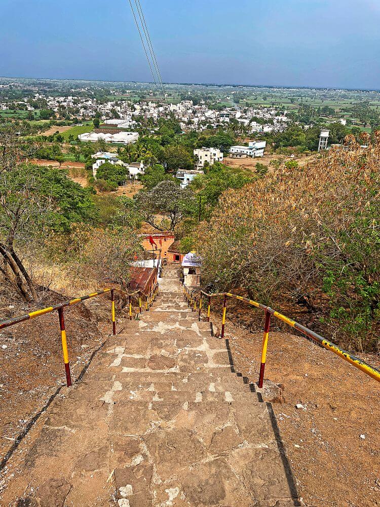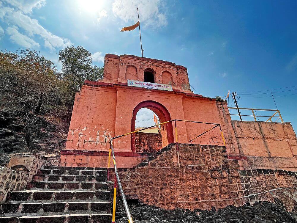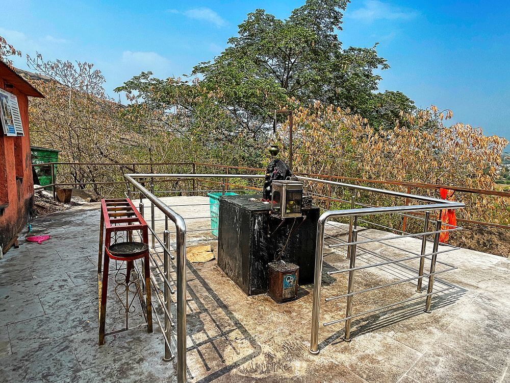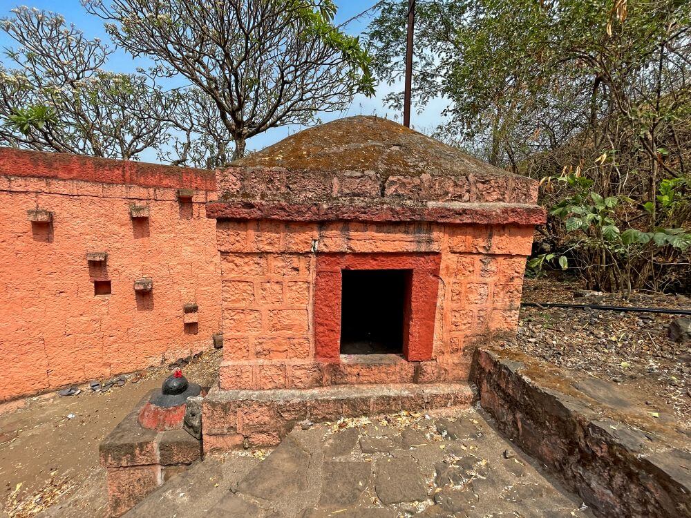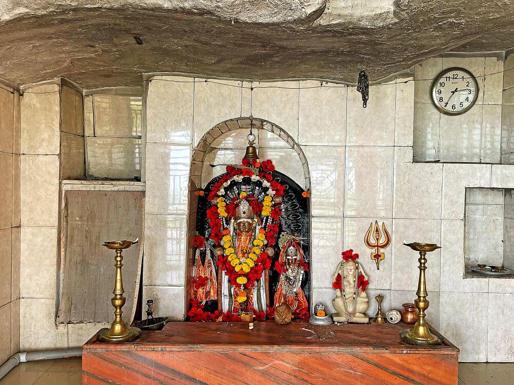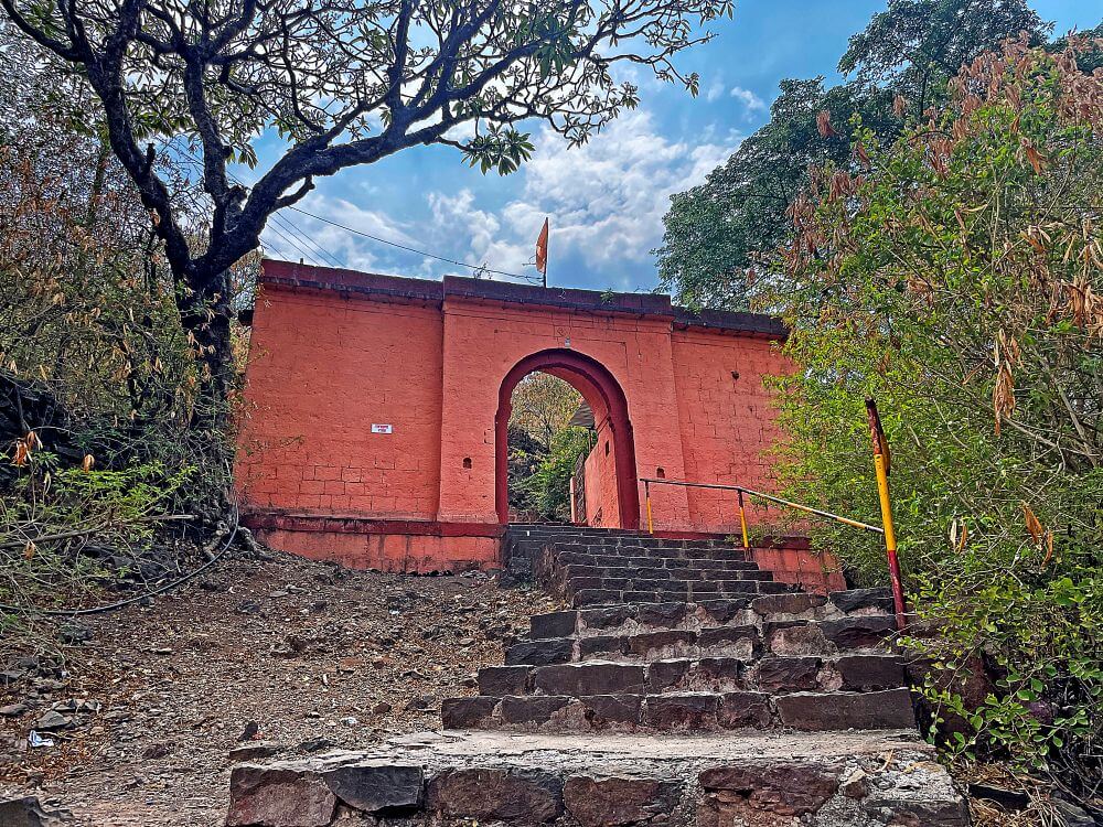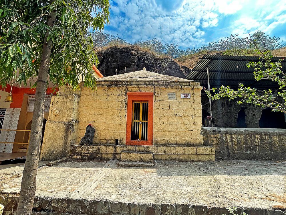 हे मंदिर डोंगर माथ्यावरील गुहेत आहे. डोंगराच्या पायथ्यापर्यंत पक्की सडक आहे. पायथ्यापासून मंदिरापर्यंत सुमारे दीडशे पायऱ्या असलेला पायरी मार्ग आहे. पायथ्यापासून वीस पायऱ्या चढल्यावर मंदिराचे पहिले स्वागतद्वार आहे. अर्धवर्तुळाकार कमान असलेल्या या स्वागतद्वाराच्या दोन्ही बाजूंस भिंतीत दीपकोष्टके आहेत. स्वागतदाराच्या पुढे पायरी मार्गाच्या उजव्या बाजूला महादेवाचे अर्धखुल्या स्वरूपाचे मंदिर आहे. मंदिरात जमिनीवर शिवपिंडी व समोर नंदी आहे. पायरी मार्गाच्या डाव्या बाजूला असलेल्या आणखी एका मंदिरात शिवपिंडी आहे.