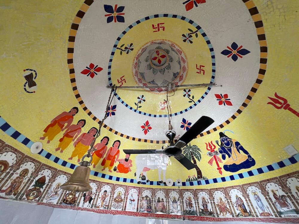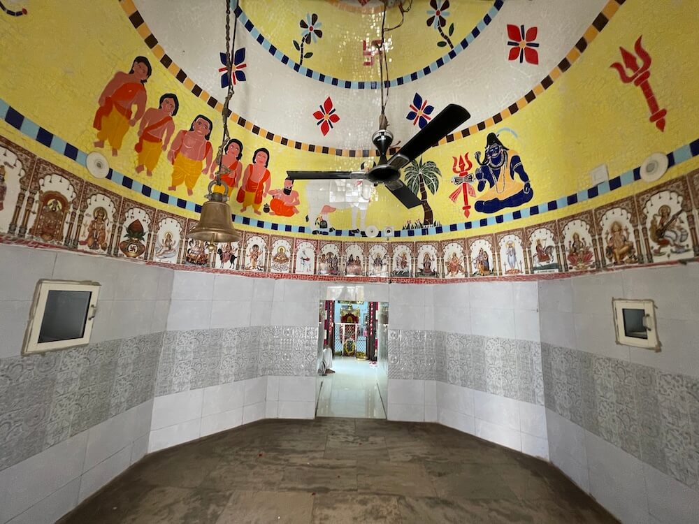 In the Darshanmandap, situated before the assembly hall entrance, an idol of ‘Nandi’ (the sacred bull) sits upon a pedestal, followed by a sculpture of a tortoise. The enclosed circular Sabhamandap features octagonal pillars carved with various deities and geometric patterns. Its ceiling is vibrantly painted with depictions of gods, foliage and fauna. Images of ‘Dwarpalas’ (gatekeepers) guard the entrance walls and the ‘Lalatabimba’ (central lintel) is engraved with a ‘Shivpinda’. The ‘Garbhagriha’ is entered through a doorway encased in silver sheets, featuring engravings of Lord Ganesha and Goddess Lakshmi. At its heart, the ‘Shivpinda’ is adorned with a brass casing and a copper cobra spreading its hood. An ‘Abhishek-patra’ (ritual vessel) hangs above and a trident stands nearby. A niche in the rear wall of the sanctum houses an idol of Goddess Parvati.
