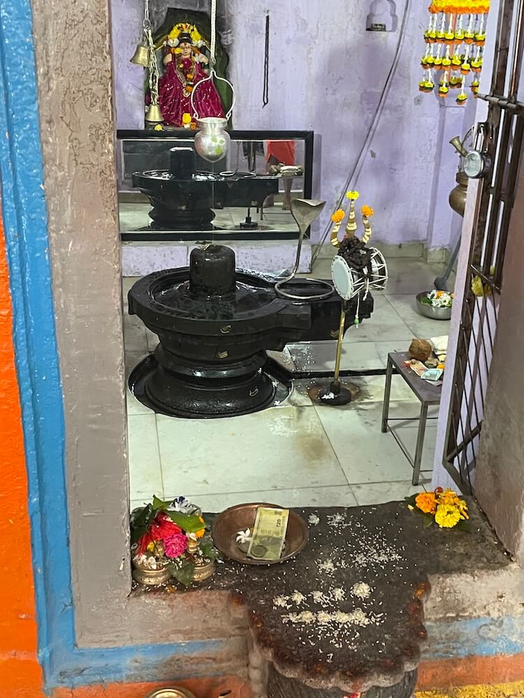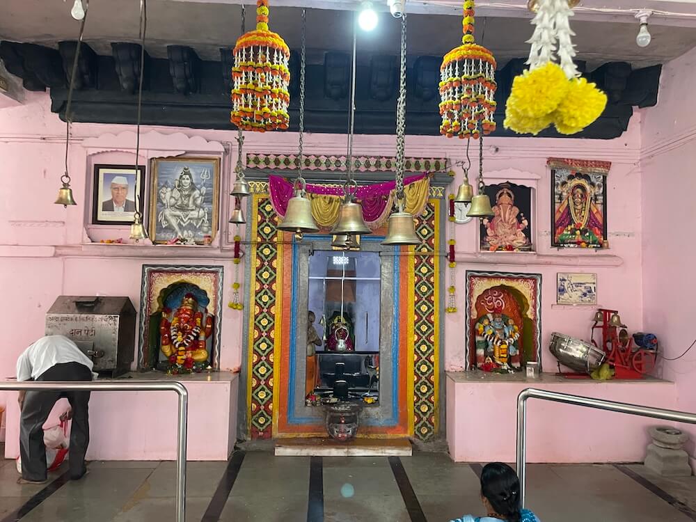 गर्भगृहाच्या प्रवेशद्वारास वेलबुट्टीशाखा व पर्णशाखा आहेत. ललाटबिंबावर गणपती शिल्प व ललाटपट्टीत पानाफुलांच्या नक्षी आहेत. मंडारकास चंद्रशिळा व कीर्तीमुख आहे. गर्भगृहात जमिनीवर मध्यभागी स्वयंभू शिवपिंडी व त्यावर छत्र धरलेला पितळी नाग आहे. जलधारा धरलेले तांब्याचे अभिषेक पात्र छताला टांगलेले आहे. गर्भगृहात मागील भिंतीतील देवकोष्टकात चतुर्भुज भैरवी शिल्प आहे. देवीच्या हातांत त्रिशूल, डमरू व कमंडलू आहेत आणि एक हात अभयमुद्रेत आहे.