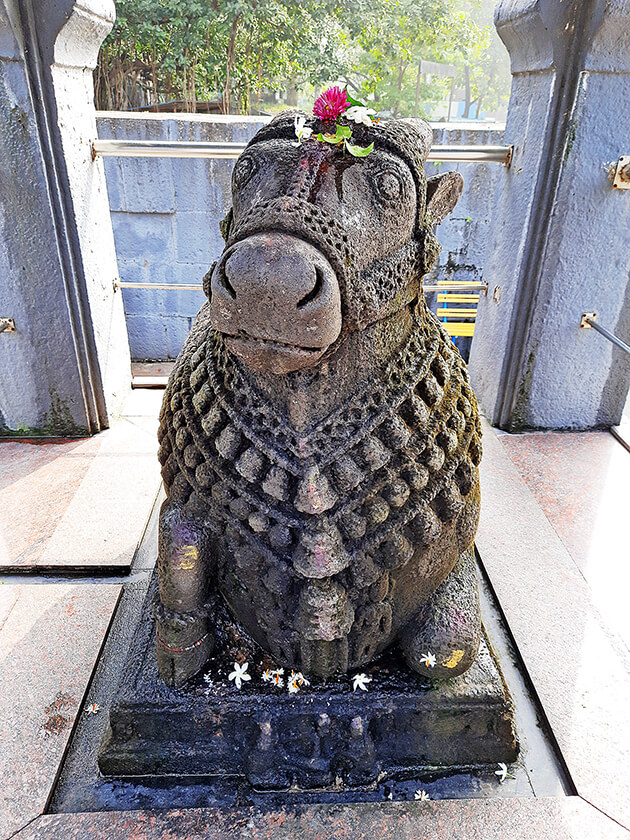 मंदिराचा आकार फार मोठा नसला तरी त्याची बांधणी अत्यंत सुबक आहे. चार फूट उंचीच्या अधिष्ठानावर असलेल्या या मंदिराची नंदीमंडप, सभामंडप व गर्भगृह अशी संरचना आहे. चार फूट उंचीच्या अधिष्ठानावर प्रदक्षिणा मार्ग सोडून आतील बाजूला चार दगडी स्तंभ असलेला नंदीमंडप आहे. या स्तंभांच्या मध्यभागी नंदीची अखंड काळ्या पाषाणातील वैशिष्ट्यपूर्ण कोरीव मूर्ती आहे. या नंदीचे पुढचे दोन्ही पाय दुमडलेले आहेत. मागचा डावा पाय त्याने पोटाखाली घेतला असून उजवा पाय गुडघ्यातून वाकवला आहे. त्याच्या अंगावर विविध अलंकार आहेत. गळ्यातून खांद्याच्या मागे बांधलेला तिनपदरी पट्टा आहे. त्यावर लहान घंटा ओवलेल्या दिसतात. या पट्ट्यावरील मुख्य तीन घंटा मोठ्या आकाराच्या आहेत. नंदीच्या कपाळावरही कोरीव नक्षीकाम आहे. नंदीमंडपातील चार स्तंभ एकमेकांना महिरपी कमानीच्या आकारांनी जोडलेले आहेत. त्यावरील भागात छतावर बाशिंगी कलाकुसर आहे. छतावर मुख्य शिखराच्या चारही बाजूने लहान लहान शिखरे आहेत.