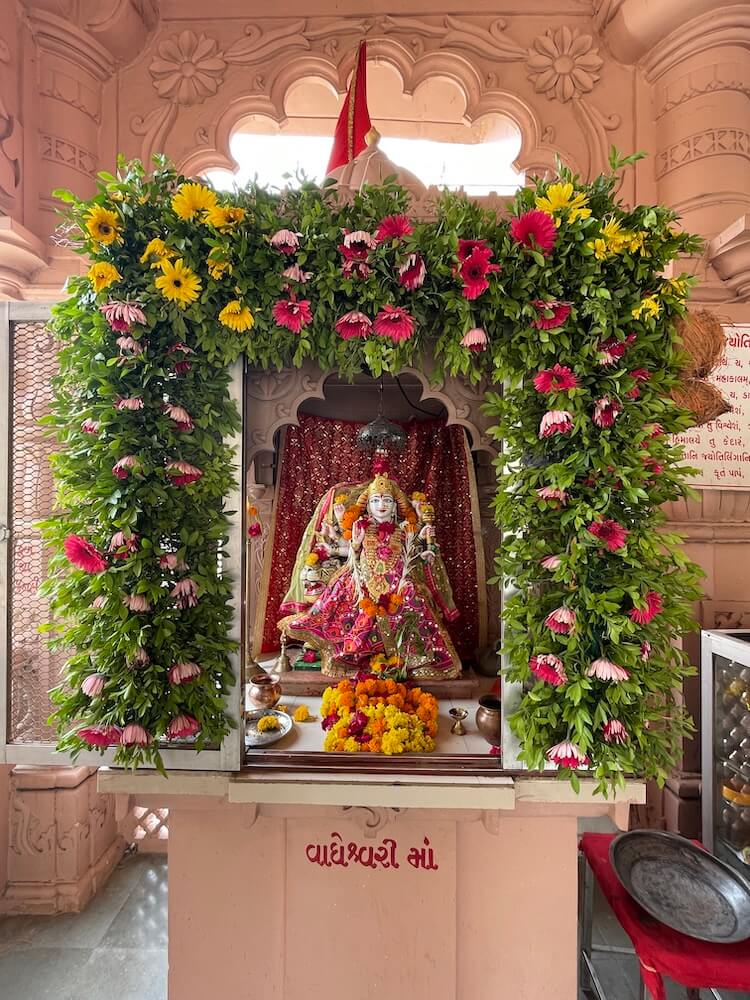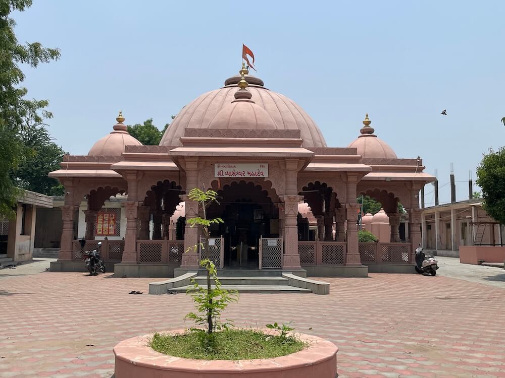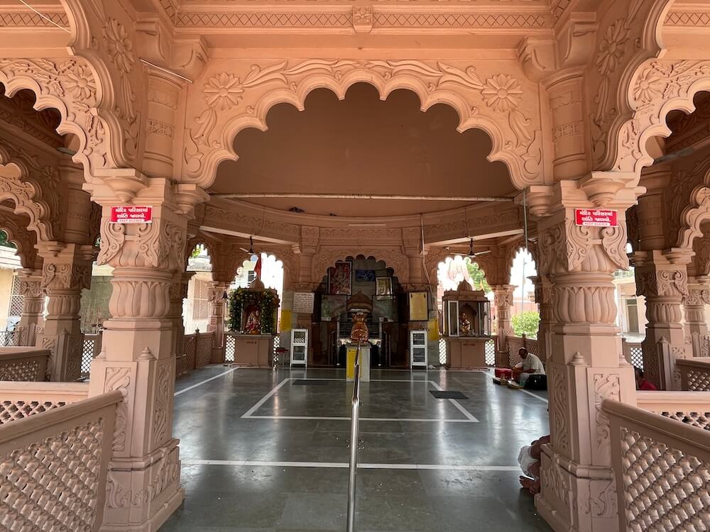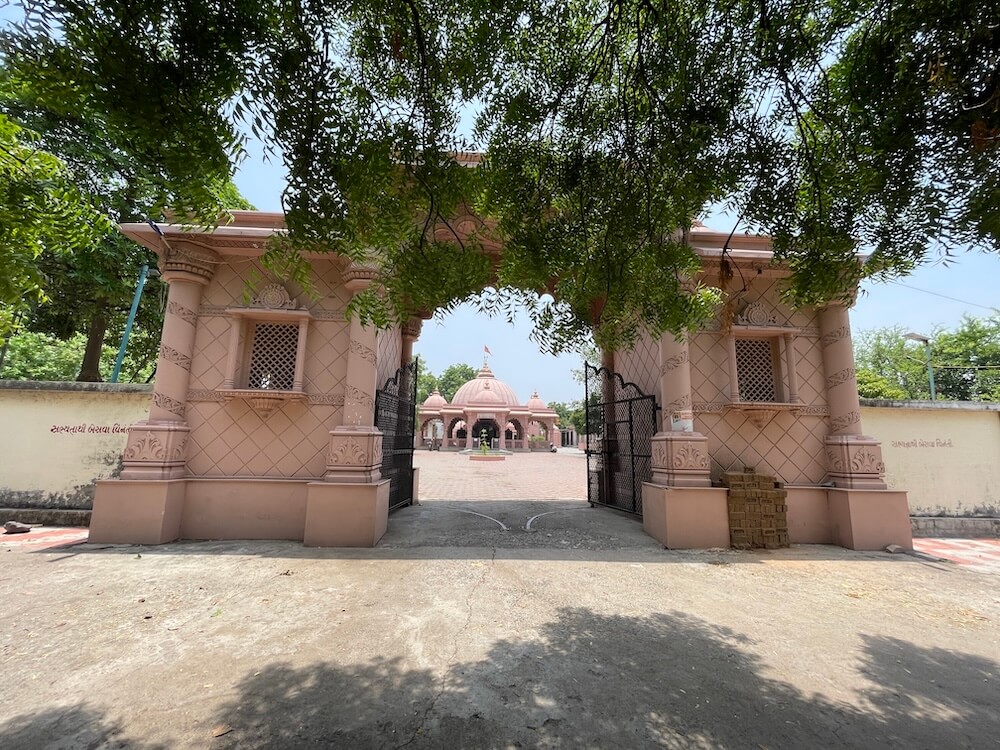 Situated in a sprawling campus between the villages of Dena and Dumad, to the west of the Vishwamitri riverbed, this ancient temple complex features a striking pink sandstone gateway. This entrance, adorned with ornately carved columns and archways, leads to a courtyard where the tombs of past temple priests are said to reside. Beyond the gate rises the main temple, constructed from red Rajasthani stone. Its layout includes a central assembly hall (sabhamandap), flanked on three sides by viewing mandaps,