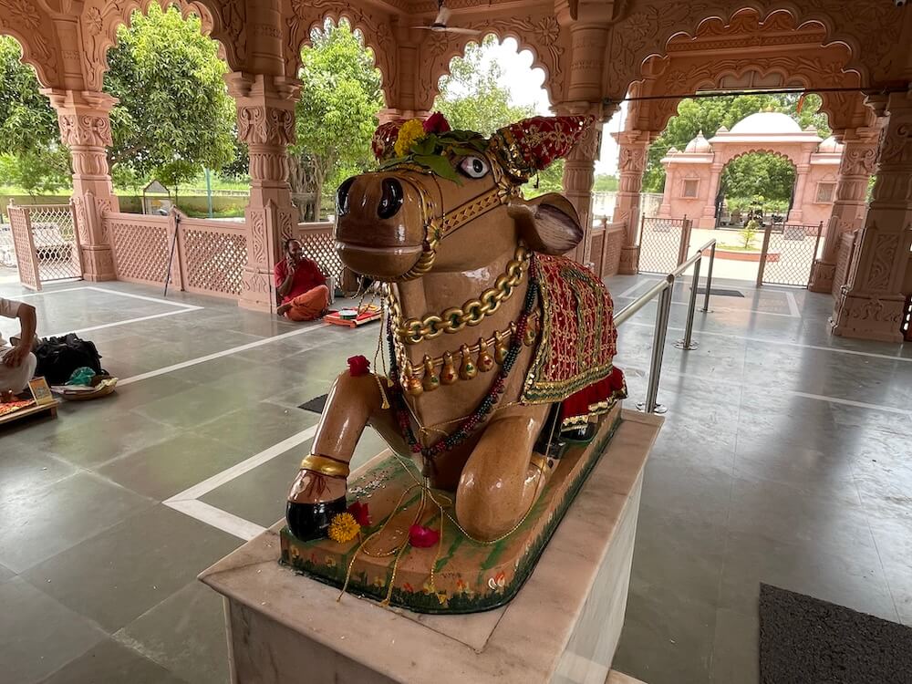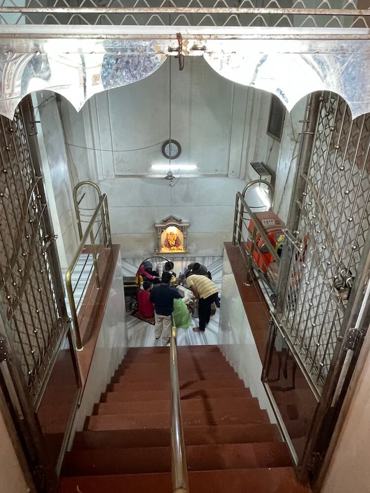 The sabhamandap is open and richly decorated with intricately carved columns and ceiling work. At its center stands a beautifully sculpted statue of Nandi on a marble platform, with a tortoise figure in front. To the left, on a raised platform, is the idol of Ashtabhuja Vagheswari Devi riding a tiger. On the right side rests a statue of Kartikeya astride a peacock. Within the antechamber, there is a shrine to Hanuman on the left and to Ganesha seated on a lotus on the right. The entrance to the sanctum features delicate carvings, with an image of Ganesha engraved on the lintel. Symbolic motifs and guardian deities are sculpted at the base of the door pillars. Descending 24 steps, devotees enter the sanctum to behold the self-manifested, elongated Shivling enshrined in an octagonal marble pedestal (shalunka), adorned with a silver serpent holding a parasol. Above it, water continuously drips for ritual bathing (abhishek). On the wall behind the Lingam, in a separate shrine, sits the idol of Goddess Parvati.