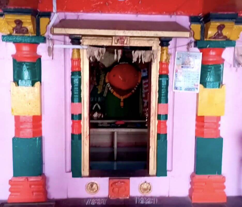 प्रवेशद्वारासमोर कोरीव पाषाणात बांधलेल्या पाच पायऱ्या आहेत. प्रवेशद्वाराच्या दोन्ही बाजूला द्वारपाल चित्रे रंगवलेली आहेत व ललाटबिंबस्थानी गणपतीची मूर्ती आहे. बंदिस्त स्वरूपाच्या सभामंडपात प्रत्येकी चार नक्षीदार स्तंभांच्या चार रांगा आहेत. प्रवेशद्वाराकडील स्तंभ कठड्यात व दोन्ही बाजूचे स्तंभ भिंतींत आहेत. सर्व स्तंभ चौकोनी स्तंभपादावर उभे आहेत. स्तंभदंडात चौकोन, षट्कोन, अष्टकोन, वर्तुळ असे विविध भौमितिक आकार आहेत. स्तंभांच्या शीर्षभागी कणी व त्यावर हस्त आहेत. हस्तांवर फणाधारी नागशिल्पे आहेत.