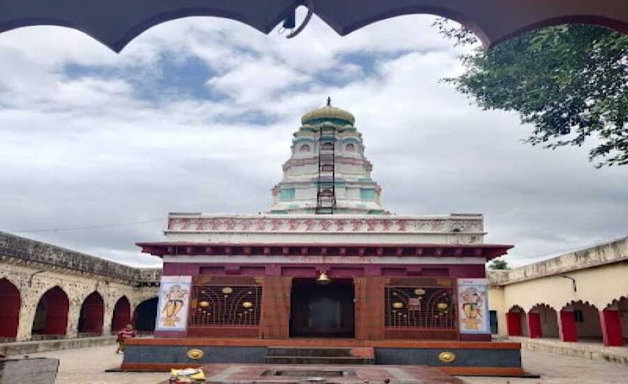 हे मंदिर गावापासून काही अंतरावर आहे. वाहनतळापासून मुख्य मंदिराच्या प्रवेशद्वारापर्यंत असलेल्या पायवाटेच्या दोन्ही बाजूला कठडे आहेत. त्यांत भाविकांना बसण्यासाठी आसने आहेत. दोन्ही बाजूच्या कठड्यांत एकमेकांना महिरपी कमानीने जोडलेले प्रत्येकी सात चौकोनी स्तंभ आहेत. मंदिराभोवती असलेल्या भक्कम तटबंदीत मुख्य प्रवेशद्वार आहे. प्रवेशद्वारावर महिरपी कमान व दोन्ही बाजूला नक्षीदार लाकडी झडपा आहेत. या झडपांवर पितळी सिंहशिल्पे आहेत. येथून मंदिराच्या प्रांगणात प्रवेश होतो. प्रांगणात सभोवतीने तटबंदीला लागून उंच चौथरे असलेल्या ओवऱ्या आहेत. ओवऱ्यांमधे समोरील बाजूला महिरपी कमानीने जोडलेले चौकोनी स्तंभ आहेत. या ओवऱ्यांचा वापर भाविकांसाठी विश्रामस्थान व भक्तनिवास म्हणून केला जातो.