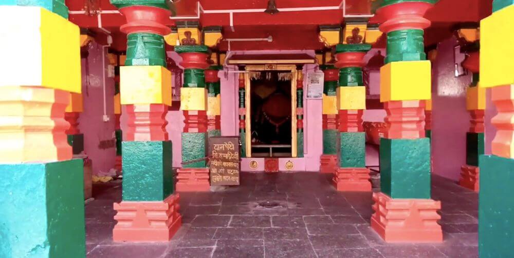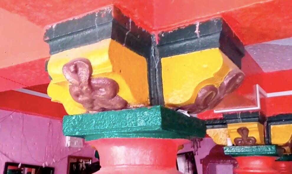 प्रवेशद्वारासमोर कोरीव पाषाणात बांधलेल्या पाच पायऱ्या आहेत. प्रवेशद्वाराच्या दोन्ही बाजूला द्वारपाल चित्रे रंगवलेली आहेत व ललाटबिंबस्थानी गणपतीची मूर्ती आहे. बंदिस्त स्वरूपाच्या सभामंडपात प्रत्येकी चार नक्षीदार स्तंभांच्या चार रांगा आहेत. प्रवेशद्वाराकडील स्तंभ कठड्यात व दोन्ही बाजूचे स्तंभ भिंतींत आहेत. सर्व स्तंभ चौकोनी स्तंभपादावर उभे आहेत. स्तंभदंडात चौकोन, षट्कोन, अष्टकोन, वर्तुळ असे विविध भौमितिक आकार आहेत. स्तंभांच्या शीर्षभागी कणी व त्यावर हस्त आहेत. हस्तांवर फणाधारी नागशिल्पे आहेत.