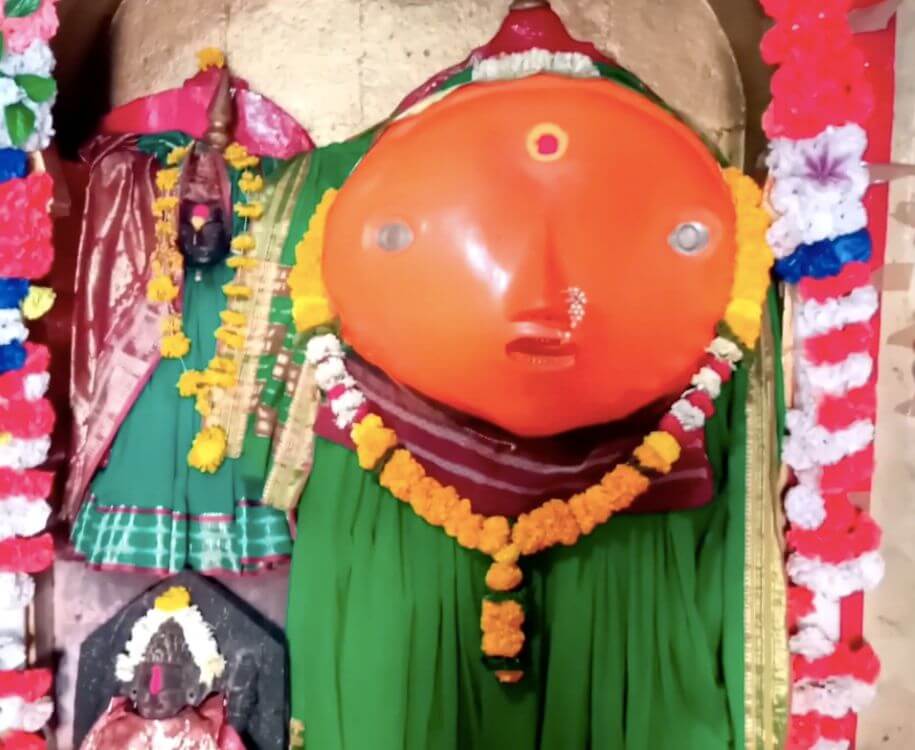 देवीचे डोळे, नाक व डोक्यावरील मुकुट चांदीचे आहेत. देवीच्या डावीकडे शक्ती मूर्ती आहे. मंदिराच्या बाह्य बाजूला जगतीवर कमळ फुलांची नक्षी कोरलेली आहे. मंदिराच्या छतावर चहूबाजूने सुरक्षा कठडा आहे. गर्भगृहाच्या छतावर भूमिज शैलीतील वर निमुळते होत गेलेले पाच थरांचे शिखर आहे. शिखराच्या खालील चार थरांत चारही बाजूंनी देवकोष्टके आहेत व त्यात विविध देवतांच्या मूर्ती आहेत. शिखराच्या पाचव्या थरात बाह्य बाजूला आठ लघूशिखरे व त्यावरील आमलकावर कळस आहेत. मुख्य शिखराच्या शीर्षभागी आमलक व त्यावर कळस आहे.